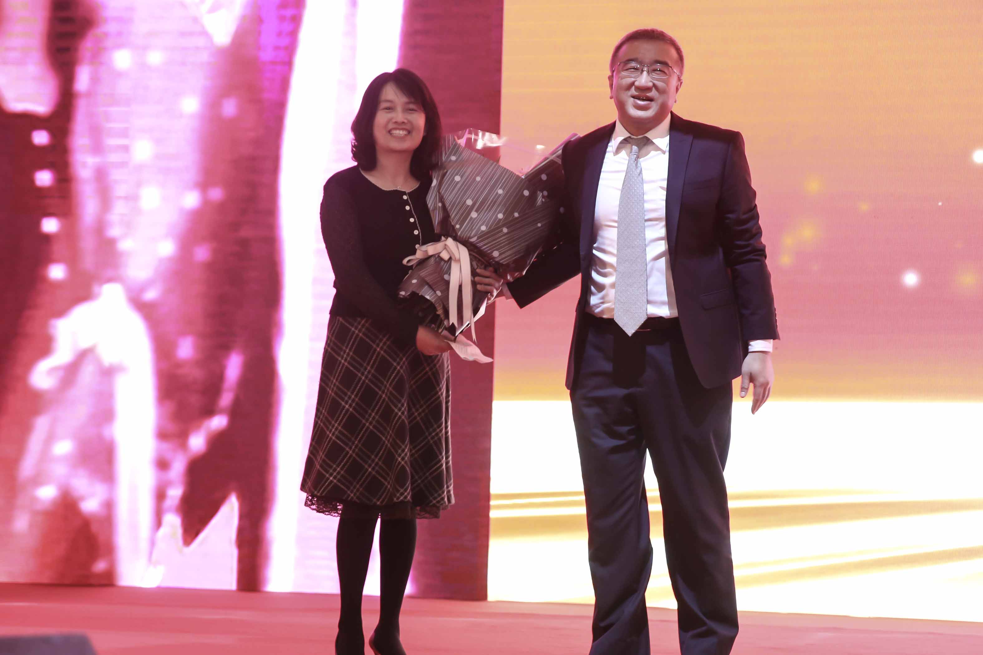 控股公司信息化总监高昊先生的夫人马艳风女士代表贤内助发言,她在发言中感谢、感恩龙工,对龙工大家庭文化非常赞赏,表示要当好贤内助,做好廉内助,全力支持丈夫的工作,祝愿龙工越来越好。她饱含深情的发言深深感染了在座的每一位龙工人。